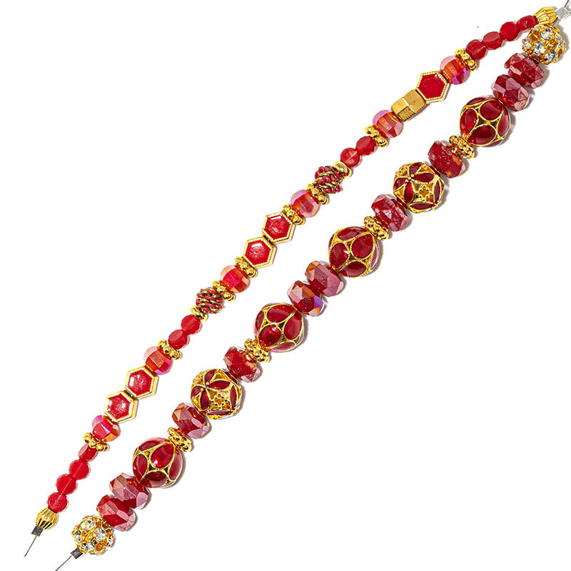 This duo of 5.5-inch bead strands feature bold cherry red color. Each set includes gold-plated brass metal Cloisonné beads decorated with cherry red enamel, faceted glass beads, pressed glass beads, electroplated gold and cherry red beads, gold-plated brass spacers, and gold-plated rhinestone ball beads. Largest bead in set measures 10mm. Smallest bead in set measures 4mm x 2mm.