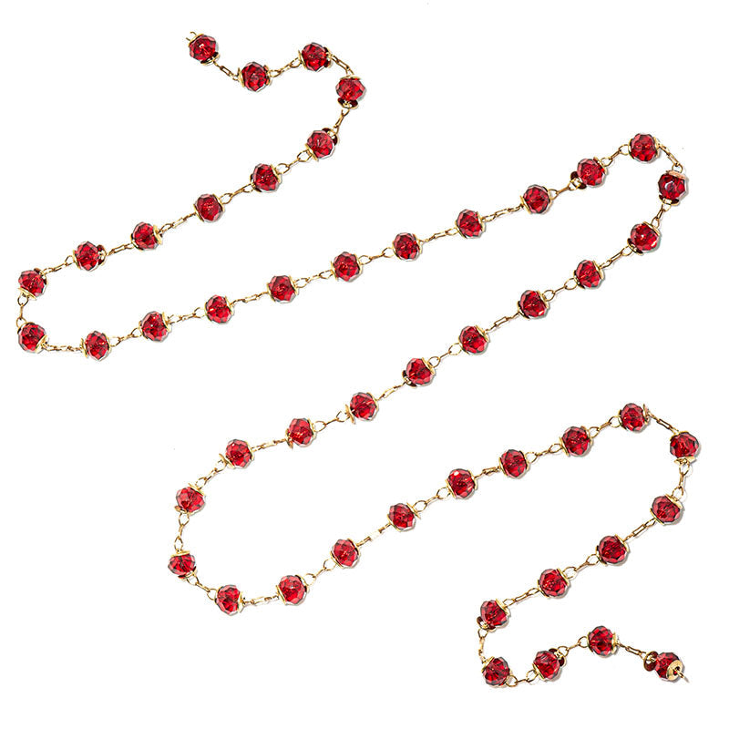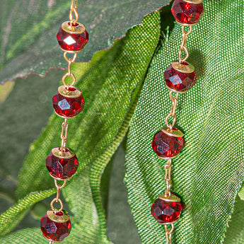 This stunning brass chain includes a bright gold-plating and 4mm cherry red glass beads. Perfect for necklaces, bracelets, and more. Chain is sold in 24-inch increments, perfect size for DIY necklaces!