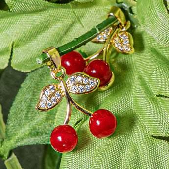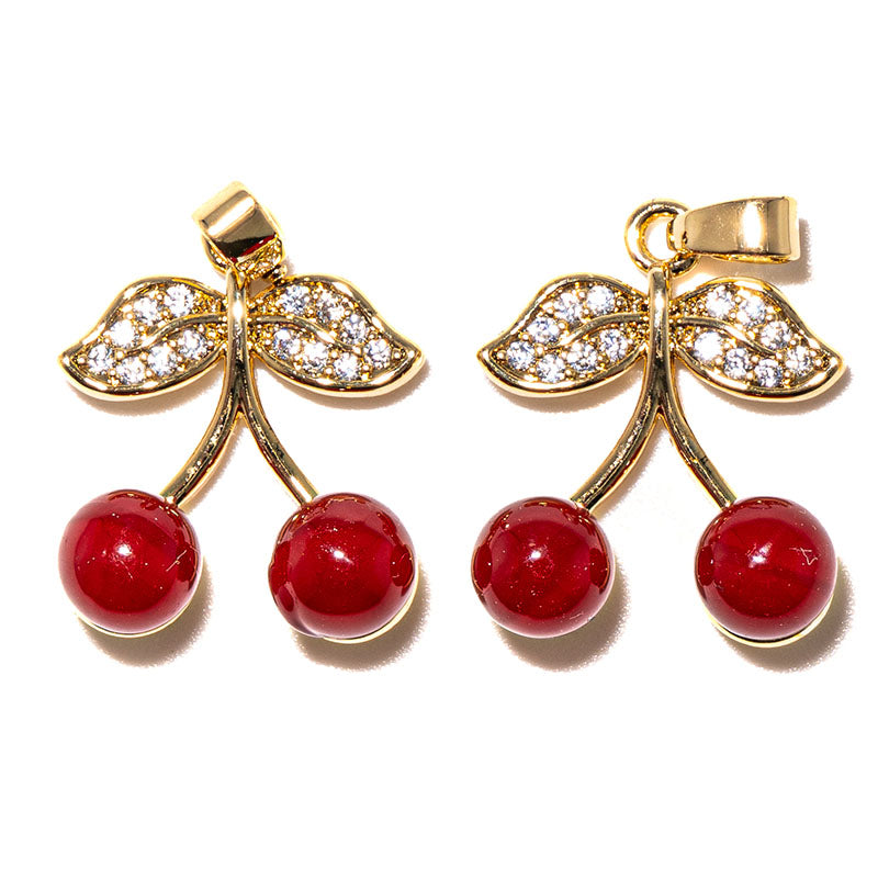 This stunning duo of alloy metal cherry pendants features a bright gold plating and stunning cubic zirconia rhinestones. Each pendant features bright red round beads for a Cherry red finish. Pendants measure 18mm x 15mm x 7.5mm.