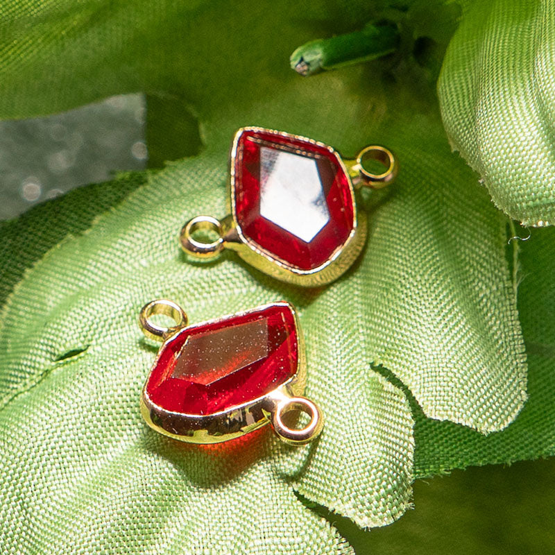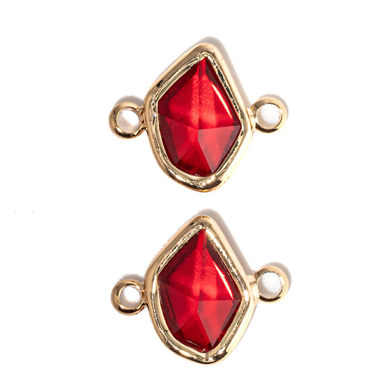 This stunning glass connector pair features a bright cherry red glass centerpiece accented with brass metal in a gold-plated finish. Each connector measures 12mm x 14mm x 4.5mm. 2 pieces per set.