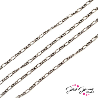 36 inches of beautiful true gun metal plated figaro style chain. This chain features larger links followed by three small circular links. Chain is 1.9 mm thick at thickest point and is nickel and lead free.