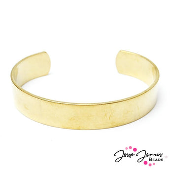 This brass bracelet cuff is finished with a bright gold-like color and measures 12.6 mm x 66.1 mm x 1.6 mm. Customize your cuff with beads and tassels, or stamp your own custom patters and words into the metal.