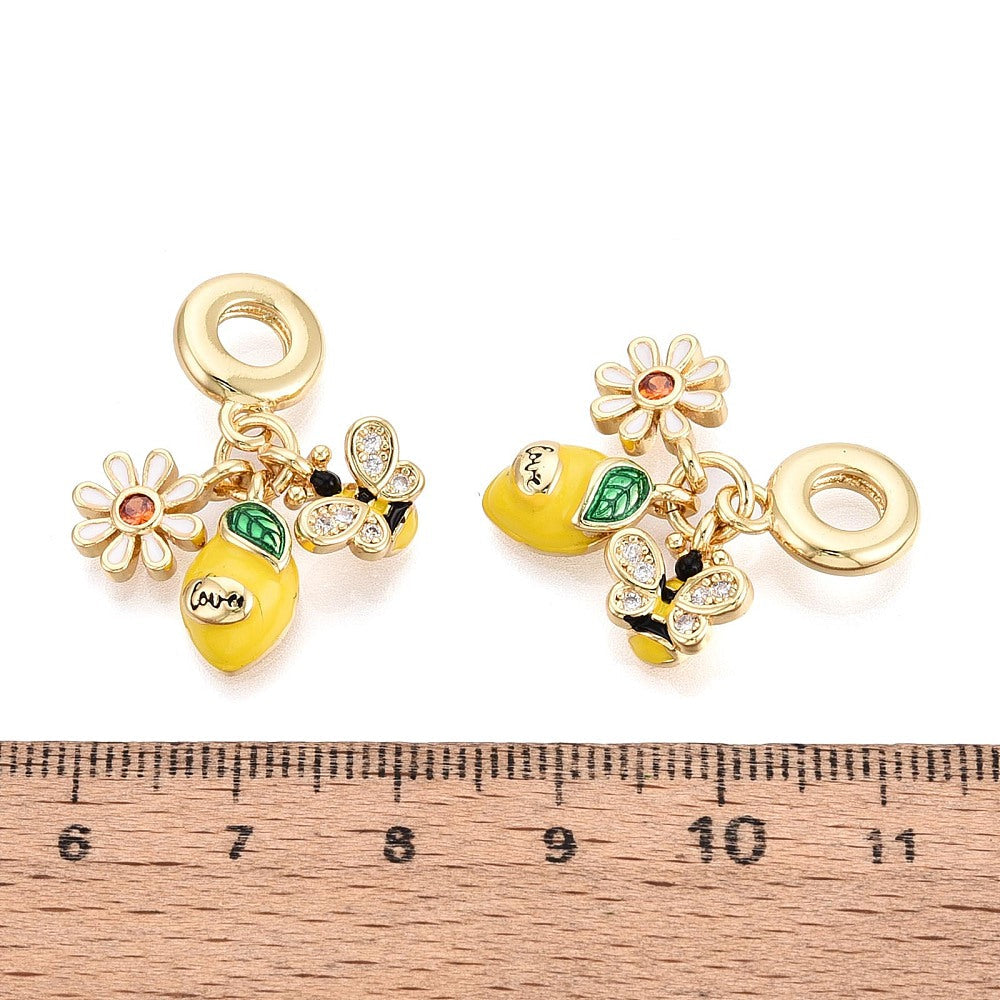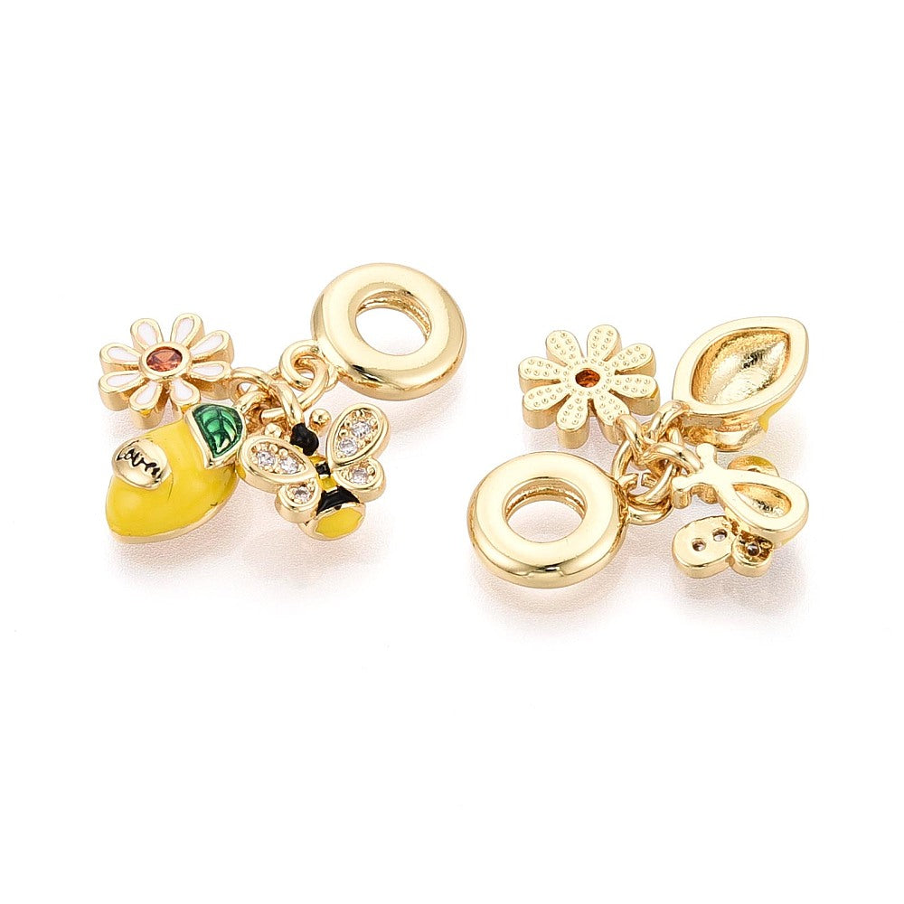 This playful trio of citrusy charms features a lemon, bee, and daisy charm attached to a large-hole bail. This bail makes it easy to add this trio to thicker leather, chain, bracelet blanks, and more. 18K gold plated brass gives these charms a stunning sparkle and gold color with touches of enamel. Each charm measures approx. 12mm. 4.8 inner bail size.