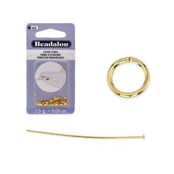 Ready to bead? This bundle is ready to arm you with all the basic findings you will need to create jewelry! Each bundle includes a pack of #2 crimp tubes (1.5 grams), a pack of 50 6mm jump rings, and a pack of 71 flat head pins.