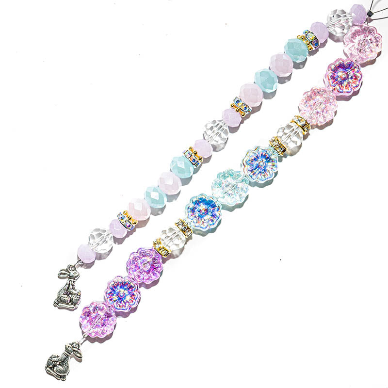 This adorable pastel duo of 6-inch bead strands features an assortment of pressed glass flowers, faceted glass rondelles, rhinestone spacers, and adorable easter bunny charms. Largest bead measures 14mm x 6.5mm. Smallest bead measures 8mm x 2mm. 42 pieces total.