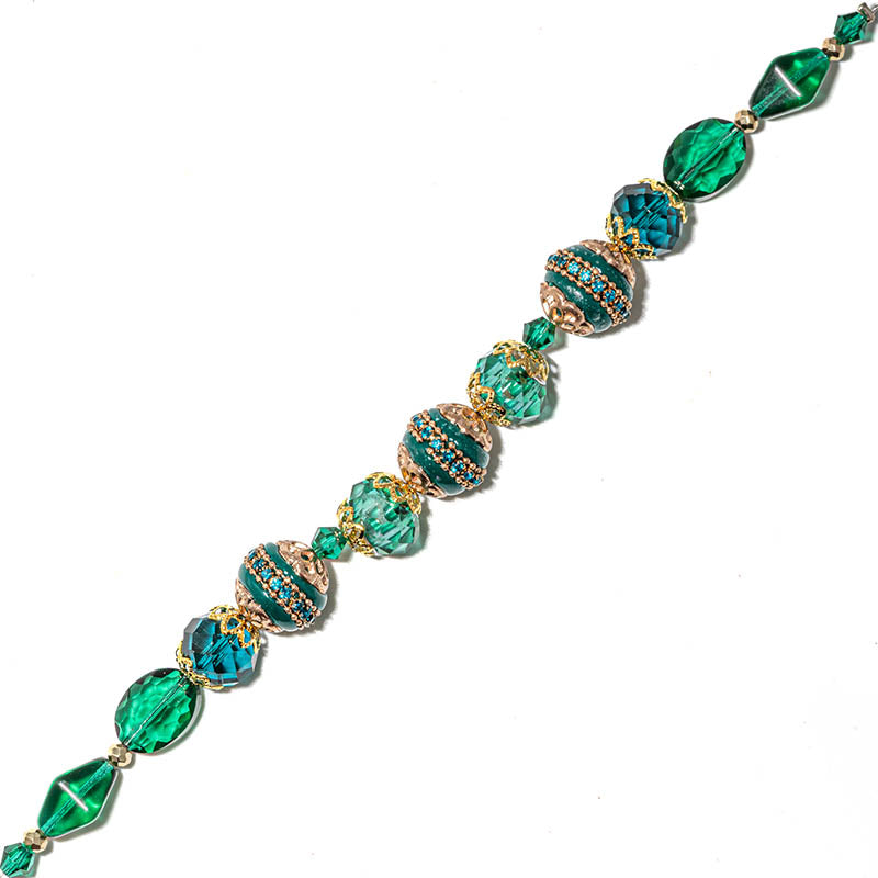 This stunning 7-inch bead strand features a trio of clay boho beads paired with faceted glass rondelles, Czech glass lantern cut beads, faceted glass ovals, mini faceted glass bicones, and gold-plated metal accents. Largest bead on strand measures 16mm. Smallest bead in set measures 4mm.