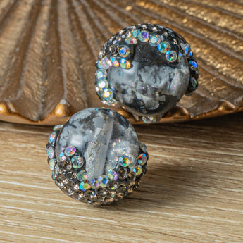 A sweet touch that's not too sweet! This sweet candy-inspired boho bead features a whimsical clouded base adorned with a splash of sparkling rhinestones. Center of boho bead is a thick glass while the rhinestones are adorned in a layer of clay. Sold in pairs. Beads measure approx. 19mm each. Perfect for pendants, earrings, bracelets, and more.