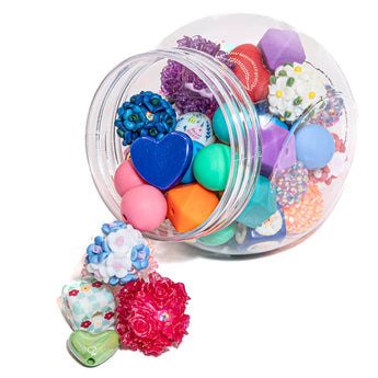 Get crafty and create playful keychains, beaded pens, bracelets, and more with this set of stunning focal silicone beads. Each vibrant set features an array of Silicone focal beads, acrylic flower beads, Lampwork flower beads, glass focal beads, focal heart beads, and more! This bold bead mixes contain over 50 focal pieces plus a sprinkling of rhinestone spacers, heishi beads, and smaller design elements. Largest bead in mix measures approx. 25mm. Smallest piece in mix measures 4mm x 2mm. Contents may vary.