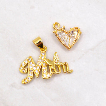 Bring heartfelt sparkle to your jewelry creations with this duo of Brass Micro Pave Cubic Zirconia Charms. The first piece features a classic heart charm plated with real 18K gold, measuring 12.5mm x 9.5mm x 5mm and set with shimmering cubic zirconia for a brilliant, timeless look. The second charm, designed in a meaningful Mother’s Day–themed word shape, also shines with clear cubic zirconia and real 18K gold plating. Sized at 15.5mm x 23mm x 3mm with a 3.5mm x 4mm hole, it’s perfect for adding a sentimental touch to necklaces, bracelets, or keepsake gifts. Together, this duo offers elegance, meaning, and radiant sparkle for any special accessory.