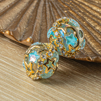 Fly through the stratusphere with these stunning AB finished beads. These adorable 18mm boho beads feature stunning gold metal-plated stars and rhinestone accents. Each bead features a clay base adorned with sparkling space-themed embellishments. Sold in pairs. Perfect for wire-wrapping, earrings, bracelets, and more!
