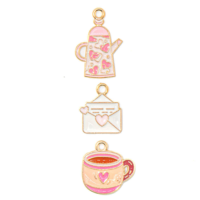 Add a touch of whimsy and love to your jewelry with this trio of enamel charms featuring a teapot with heart, a coffee cup with heart, and an envelope with heart, all in soft pink and gold tones. Perfect for bracelets, necklaces, or DIY charm projects, each charm is lightweight, detailed, and ready to inspire your creative designs. Sizes range from 16–22mm.