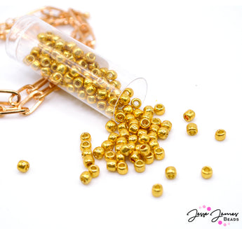 These bright gold seed beads are the perfect metallic accent for earrings, bracelets, and beyond. Create jewelry fit for a queen! Each tube contains 10 grams of sparkling seed beads. 6/0 sized seed beads measure approx. 4mm x 3mm.