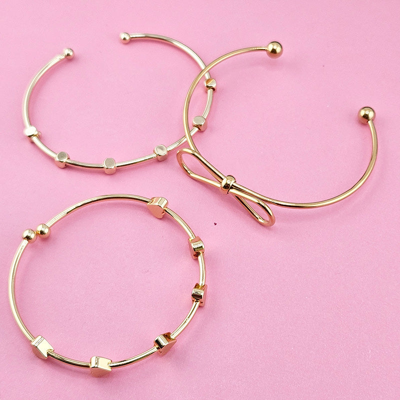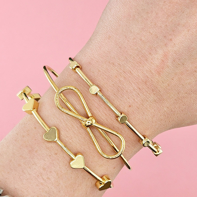This stunning stackable bracelet trio feaures 18K gold bangles in three styles. One simple bangle, one simple heart bangle, and one adorable bow-themed bangle, perfect for he holiday season. Perfect to gift or stack with your own charm bracelets. Water-resistant and tarnish-proof.