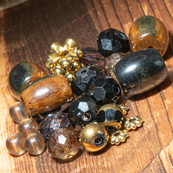 Go wild with this animal inspired bead mix. Each mix features four stunning resin immitation stone beads, perfect for adding the stunning sparkle of gemstones without adding the weight! Making them perfect for earrings or lightweight jewelry. These focal beads are accompanied by faceted glass, faceted glass coins, mini black and gold beads, antique gold spacer beads, and mini glass round. Largest piece in mix measures 14mm x 12mm. Smallest bead measures 6mm.