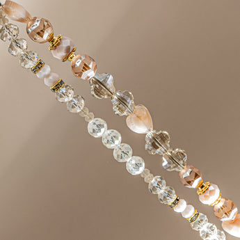 This stunning duo of 5-inch bead strands features a beautiful blend fo crystal and champagne colors. This blend of beads is perfect for creating elegant and stunning bracelets, earrings, and more. Each set includes stunning faceted glass hearts, faceted glass clovers, faceted glass rondelles, mini rondelles, faceted glass rounds, and gold-plated metal accents. Largest bead in set measures 10mm x 12mm x 8mm. Smallest bead on strand measures 4mm x 2mm.