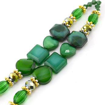 This stunning duo of 4-inch bead strands features a blend of lively green color. Each strand features faceted glass rondelles, faceted glass coins, faceted glass squares, faceted glass hearts, and gold-plated metal bead spacers. The largest bead in the set measures 14mm x 14mm x 7mm. The smallest bead in the set measures 4mm.