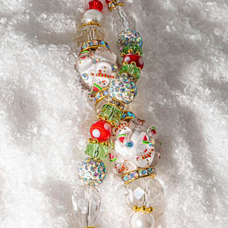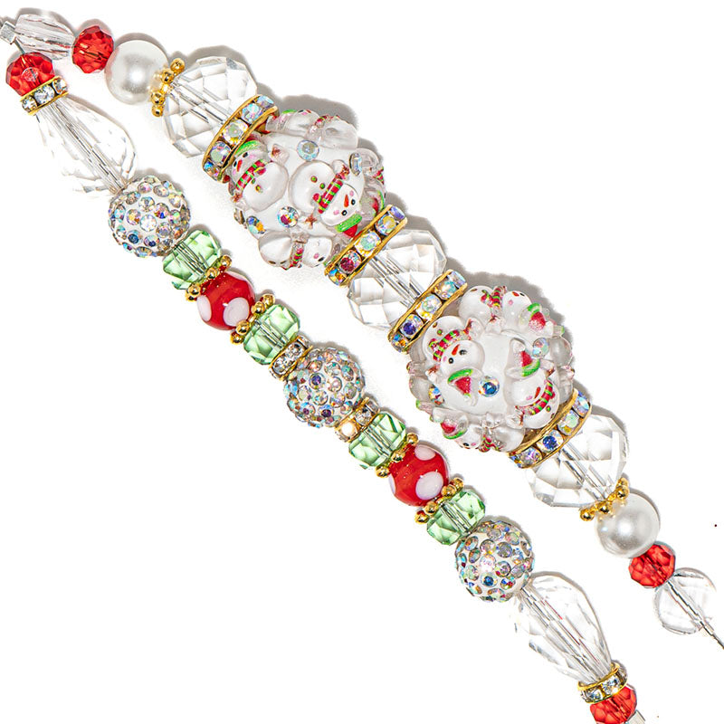 This adorable duo of bead strands features a pair of focal boho beads featuring resin snowman embeds. These stunning boho beads are paired with faceted glass, rhinestone spacers, and glass pearl beads. This adorable Winter-inspired blend is perfect for making holiday jewelry. Largest bead in set measures 20mm. Smallest bead in set measures 6mm.