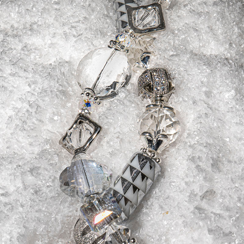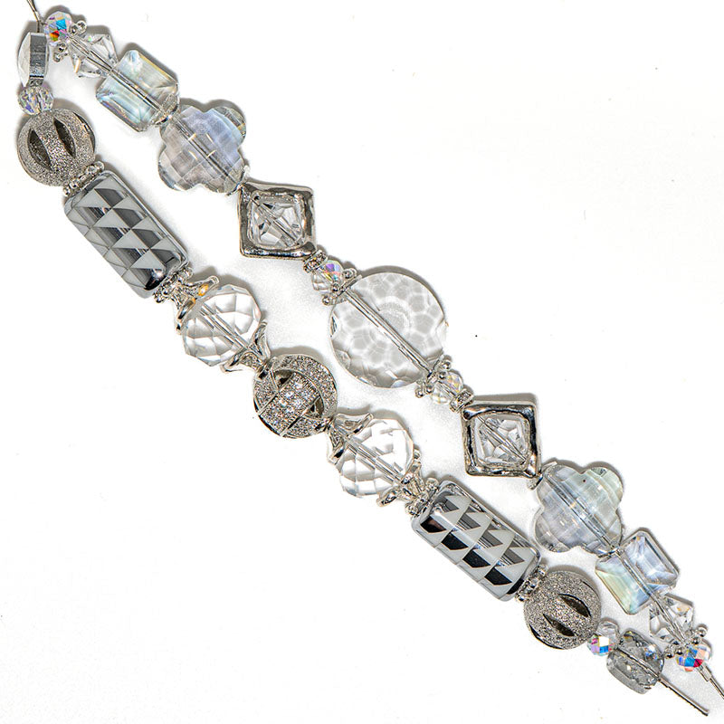 Dare to skate across the ice with this stunning duo of 5 inch crystal and white strands. Each strand includes beautiful faceted crystal glass paired with white and silver pressed glass, and silver-plated brass metal and rhinstone beads. Largest piece in set measures 20mm x 10mm. Smallest piece in set measures 4mm x 6mm.