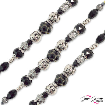 Each strand features black rose beads, faceted glass, silver metal beads, spacers, and more. Bead strand measures 7 x 1 x 0.8 inches. Largest bead on strand measures 15.5mm x 16mm. Smallest bead on strand measures 4mm.
