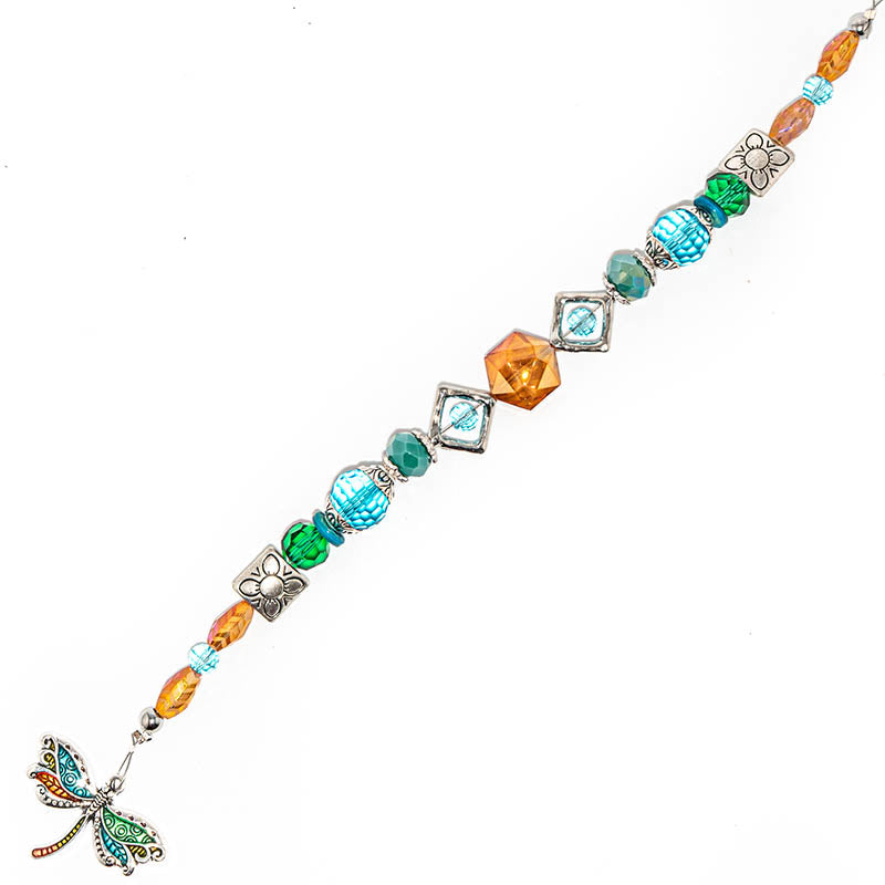 This stunning 7-inch bead strand features a blend of rich teal, orange, green, and silver colors. Dive into bold color with faceted glass rondelle beads, faceted glass hexagon shaped beads, mini glass rondelles, silver-plated brass metal square beads, silver-plated brass metal bead frames, silver-plated metal bead caps, and a focal brass metal dragonfly charm with detailed enamel filling. Perfect for designing stunning Dragonfly themed jewelry. Each strand includes 30 pieces. Largest piece measures 34mm x 24mm x 2.5mm. Smallest piece measures 6mm.