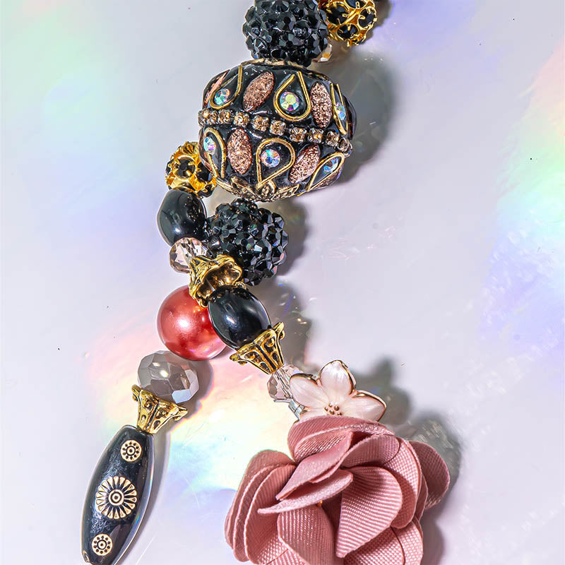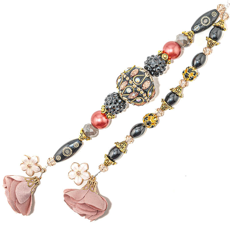 This stunning duo of 6-inch bead strands features a large focal boho bead paired with glass pearls, fancy rhinestone encrusted acrylic beads, faceted glass, rose tassels, and gold-plated brass metal spacers. Largest bead in set measures 25mm. Smallest bead in set measures 6mm.