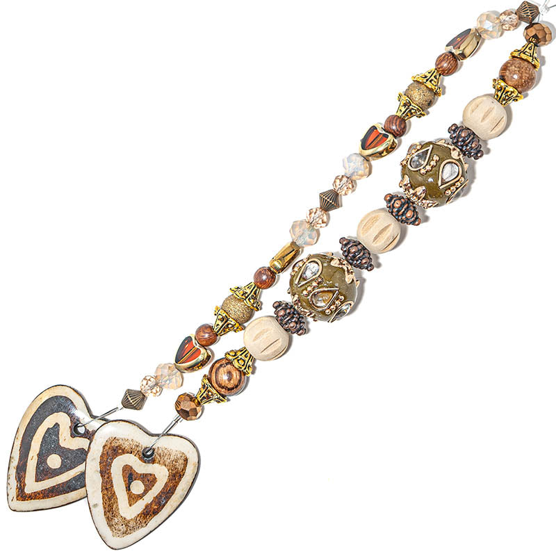Add warm color and love to your next jewelry project with this stunning duo of 7-inch bead strands. This set features a pair of classic clay boho beads, round wood beads, mini glass hearts, faceted glass rondelles, bronze-plated brass metal, and a duo of wood heart pendants. Largest piece in set measures 32mm x 28mm x 4.5mm. Smallest piece measures 6mm.