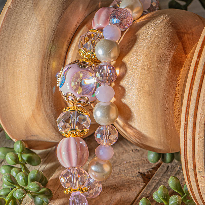 This adorable duo of 4-inch bead strands features a focal boho clay bead paired with ceramic beads, glass pearls, faceted glass rondelles, faceted glass galaxy rondelles, and mini faceted glass shapes. Largest bead in set measures 20mm. Smallest bead measures approx. 4mm x 8mm.