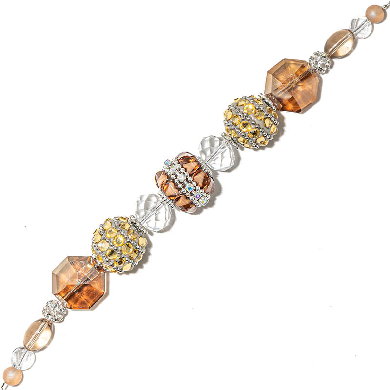 This 7-inch bead strand features a warm trio of brown and gold bead strands paired with faceted glass, faceted glass hexagons, silver-plated metals, and mini glass rounds. Largest bead measures 18mm. Smallest bead measures 6mm.