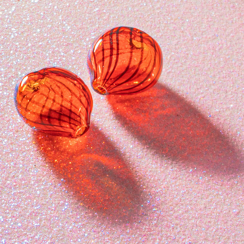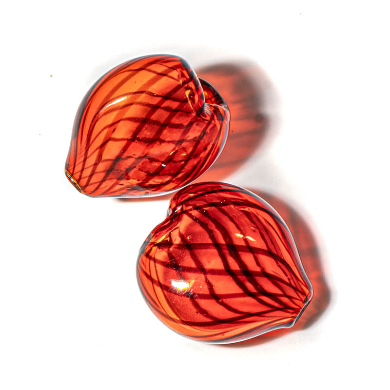 Rich and eye-catching, this lampwork focal pair features deep red glass accented with darker red vertical stripes for added depth and texture. Perfect for earrings or symmetrical jewelry designs, these bold focals bring a touch of drama and romance to any creation