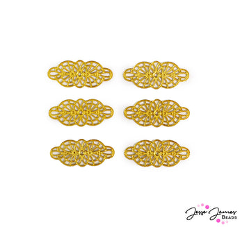 These bright gold-plated filigree accents add a bold statement to any jewelry piece. These pieces can adorn your jewelry as connectors, pendants, or as lightweight earring components. These accents are sold in a set of 6. Each piece measures 43mm x 19mm x 0.5mm.