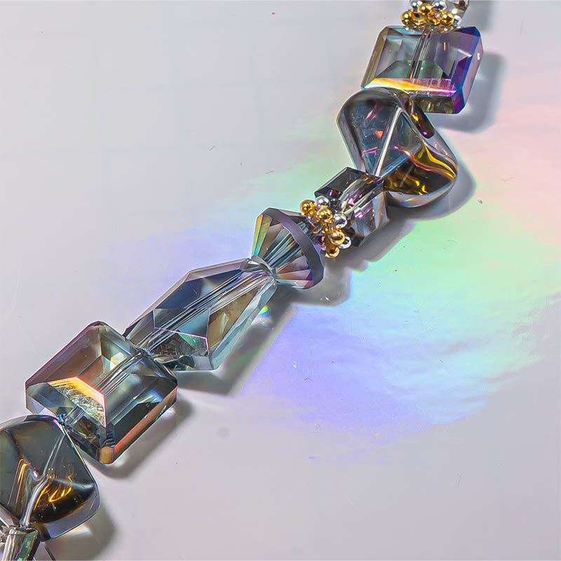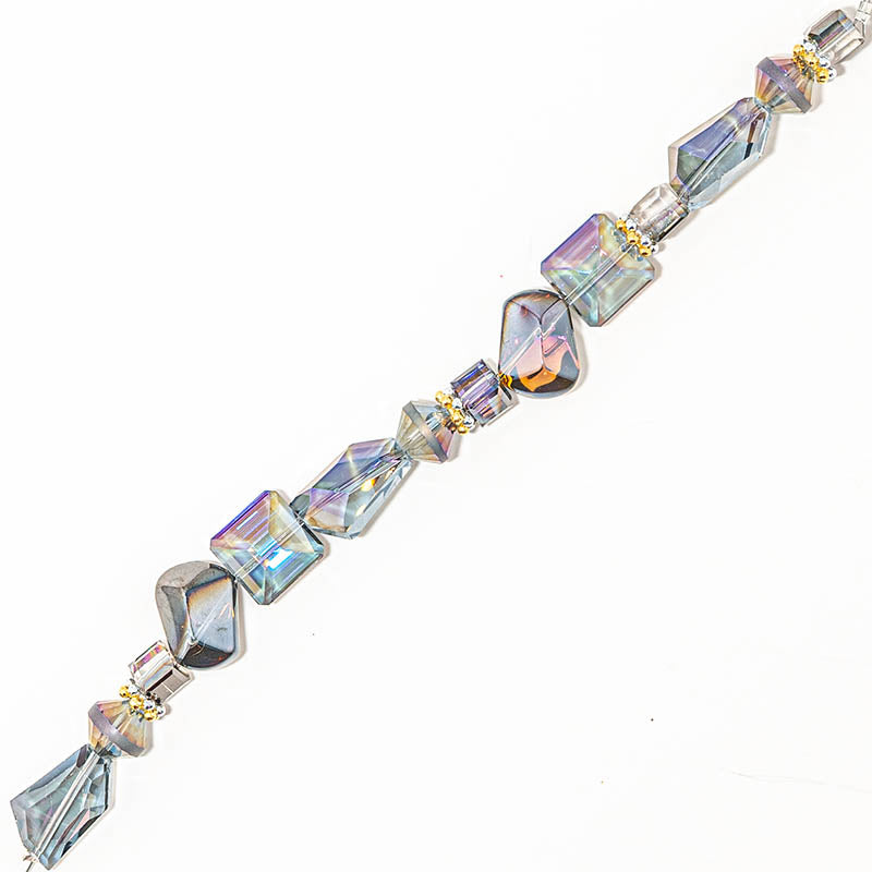 This beautiful AB glass 7-inch bead strand features stunning faceted glass beads paired with gold and silver plated brass spacers. Largest bead in set measures 15mm x 13mm x 10mm. Smallest bead measures 8mm x 2mm. Perfect for creating faceted glass beaded bracelets, earrings, and more.