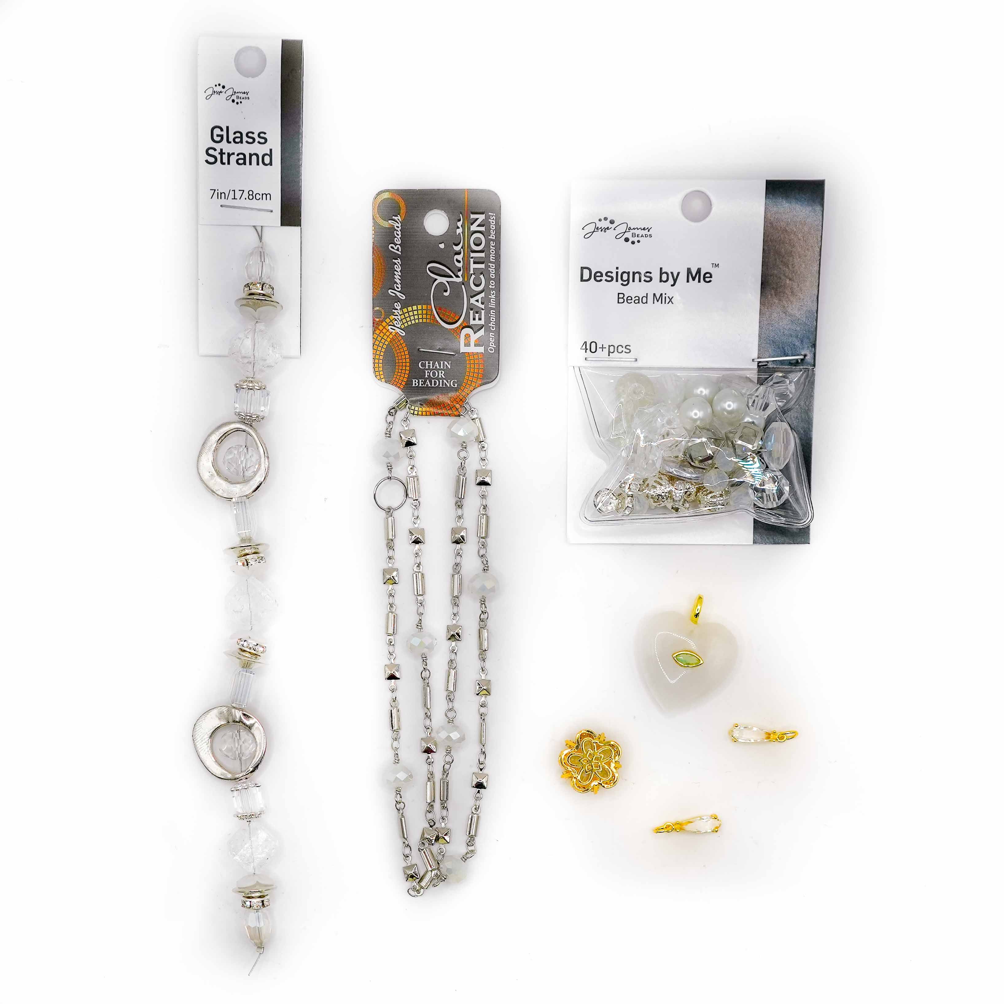 Leave a little sparkle wherever you go with this stunning sparkle-filled bead bundle. Each bundle includes a set of adorable charms including stone agate heart charms, crystal mini bead mix, crystal 7-inch bead strand, and silver and crystal chain reaction. Perfect for jewelry making, this bundle is a must-have for your bead stash.