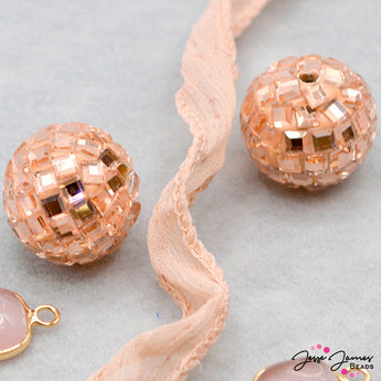 Turn your next jewelry piece into a dance party waiting to happen! These sparkling disco-ball inspired beads come in a beautiful peachy-pink color. whether you are looking to create 70's inspired earrings or add a blast of sparkle to your next necklace, these beads are a great addition to add texture and sparkle. Each bead measures 20mm. 2 beads per set.