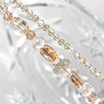 This stunning duo of 6-inch bead strands features a sparkling transparent cream color. Each set includes a strand of 4mm Preciosa glass bicones, and a strand of accenting faceted glass beads. The largest bead in the set measures 11.5mm x 11.5mm x 7mm. Smallest bead measures 4mm.