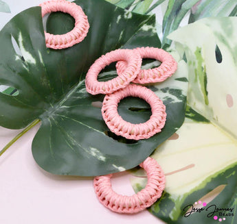 360 degrees of color! This rattan focal pair features a light pink hue overtop a natural brown base. These gnarly pieces add a classic Miami-esque feel to earrings, necklaces, and more. Each piece measures 47mm round. Sold in pairs.